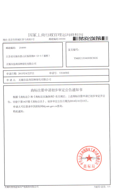 无锡市盐商园林绿化有限公司商标注册申请初步审定公告通知书 | ||