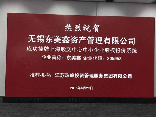 祝贺江苏珠峰集团推荐的无锡东美鑫公司今日成功挂牌上市 | ||