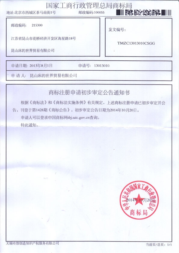 昆山床的世界贸易有限公司商标注册申请初步审定公告通知书