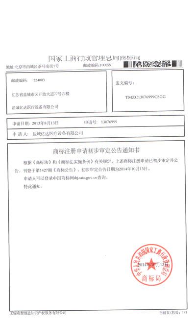 盐城亿达医疗设备有限公司商标注册申请初步审定公告通知书 | ||