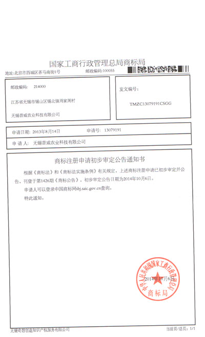 无锡普威农业科技有限公司商标注册申请初步审定公告通知书 | ||