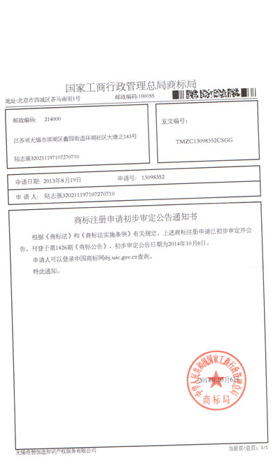 | 来源:无锡奇想创造知识产权服务有限公司 作者:匿名 发布:2014-11-10 | ||