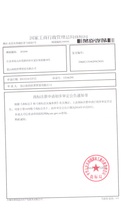 昆山床的世界商标注册申请初步审定公告通知书 | ||