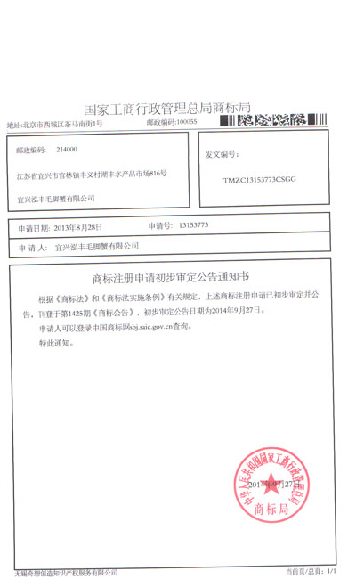 宜兴泓丰毛脚蟹有限公司商标注册申请初步审定公告通知书 | ||