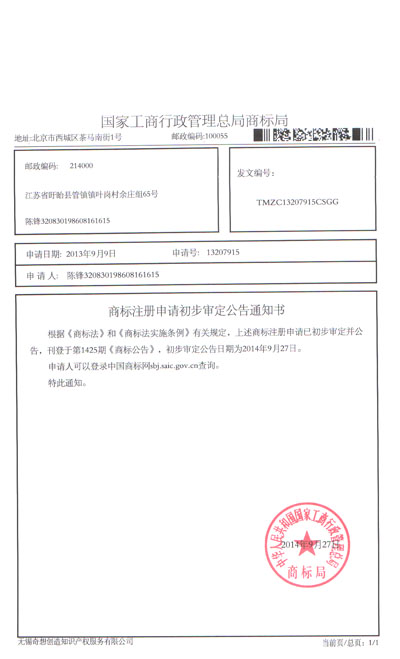 | 来源:无锡奇想创造知识产权服务有限公司 作者:匿名 发布:2014-11-10 | ||