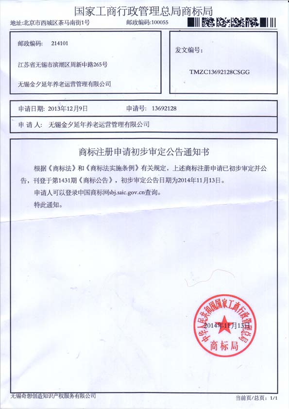 金夕延年养老运营商标注册申请初步审定公告通知书 | ||
